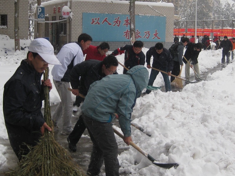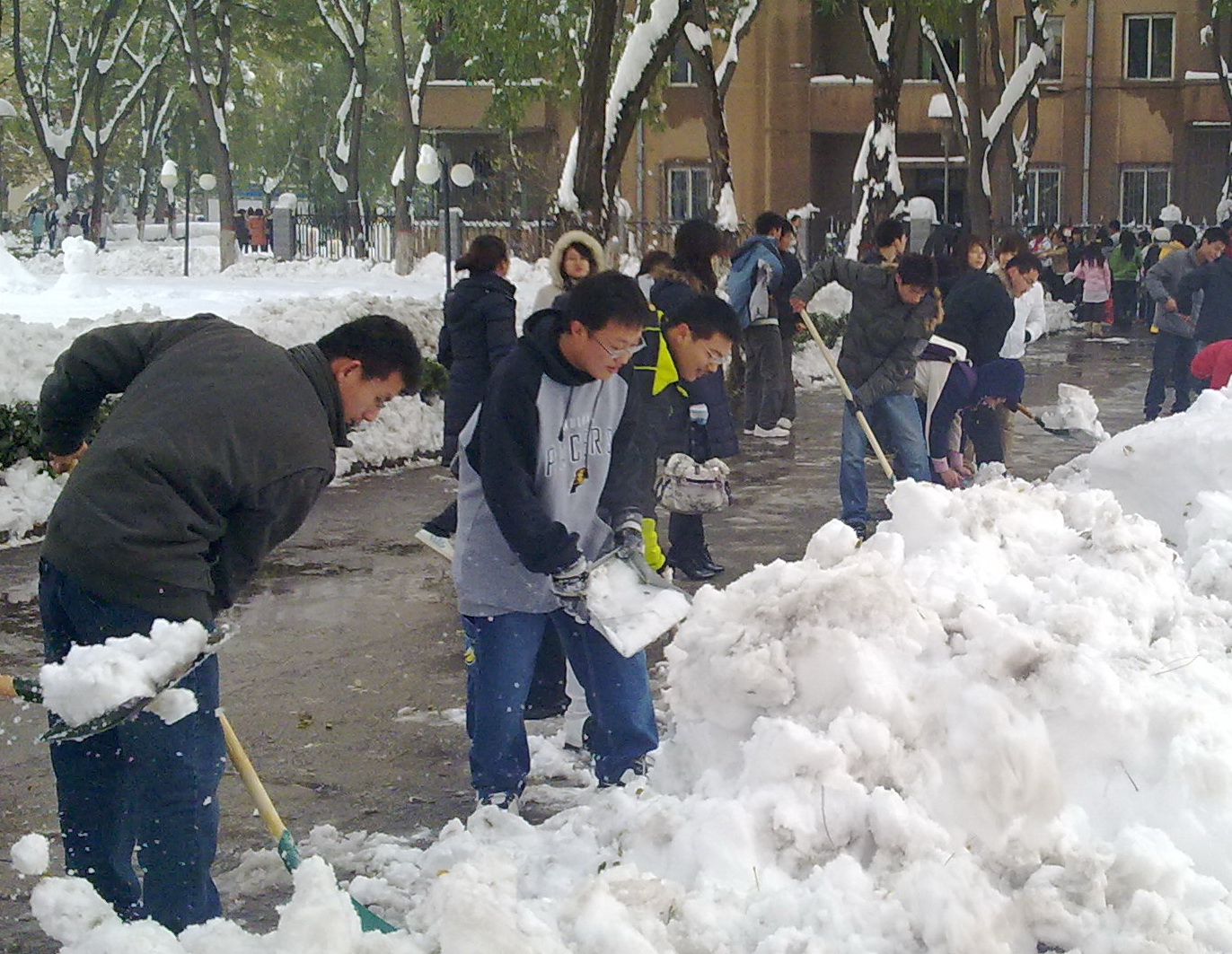 连续两天的一场瑞雪,飘飘扬扬降临大地,把整个校园装扮得银装素裹,给校园带来了清新的喜悦,创造了同学们与雪亲密接触的机会,同时似乎在向校领导和师生们报告喜讯——今年又是一个好兆头。 为避免积雪给师生出行带来不便,11月11日、12日两天,宝石学院全体同学在书记王国岩和辅导员蔡壮华老师的带领下展开了清扫积雪的活动。尽管天气寒冷,同学们的脸和手都冻红了,但大家却全然不顾,一个个争先恐后,干劲十足。只见大家有的手握铁锨铲除积雪,有的手持扫帚清扫零星雪花,劳动现场一片热火朝天的景象。雪中的校园景致分外妖娆,“白雪、青松、人群”构成了一幅动人美丽的画卷,扫雪工作在这和谐的氛围中变得不再辛苦,反而成为一种精神享受。 很快,惠馨园门前和学生食堂前方原本一片光亮的道路就变成了“绿色通道”,我们的扫雪活动为师生安全出行创造最佳的交通环境,同时也使大家从中感悟到了劳动的乐趣和团结的力量。