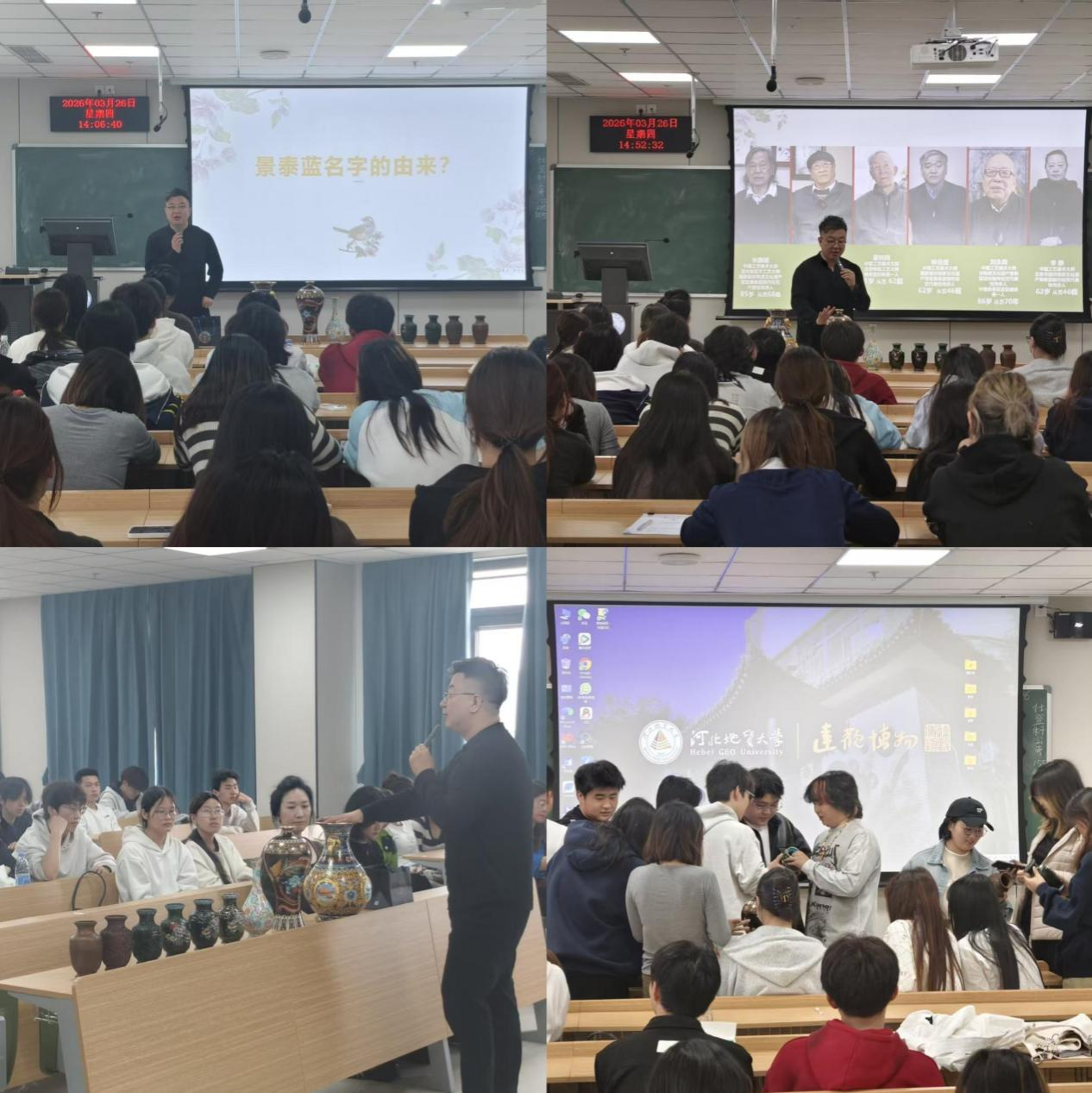 为弘扬中华优秀传统文化,推动非遗活态传承,3月26日,宝石与材料学院在教一505教室举办景泰蓝工艺历史与市场营销现状专题讲座。张同禄珐琅艺术中心策划总监及景泰蓝珍宝馆馆长常乐担任主讲嘉宾,学院副院长金翠玲主持,珠宝首饰设计专业师生与香河县景泰蓝珐琅制品厂工作人员共同参与此次非遗文化活动。