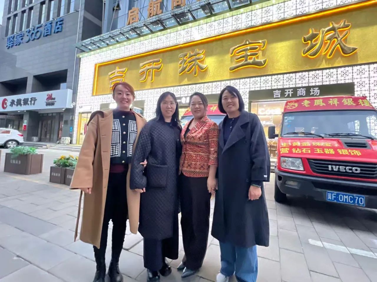 座谈结束后,在石家庄吉开珠宝城管理团队的陪同下,金翠玲副院长、辅导员张曼琳实地参观了珠宝城的产品展示区、定制加工车间、鉴定检测中心与门店运营现场。在定制加工车间,双方就“古法金工艺传承”“新媒体运营”等行业前沿话题展开交流,金翠玲副院长表示,后续学院将结合企业技术需求,调整实践教学内容,让人才培养更贴合行业实际;辅导员张曼琳则现场记录了企业各岗位的工作场景与实操要求,为后续精准开展就业指导、推送岗位信息积累一手资料。